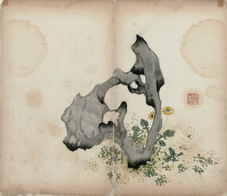 Note the woodgrain impressions in various directions that are revealed on the rock surfaces in each print. This result is achieved by printing with multiple blocks. The wood textures, along with dark and light gray contrasts, contribute to the sculptural quality of the rock. As in painting, the artist's seal is pressed on the paper after the printing, leaving an oily residue of cinnabar ink smudged into the surrounding area. The seals identify these prints as part of the literati culture.
