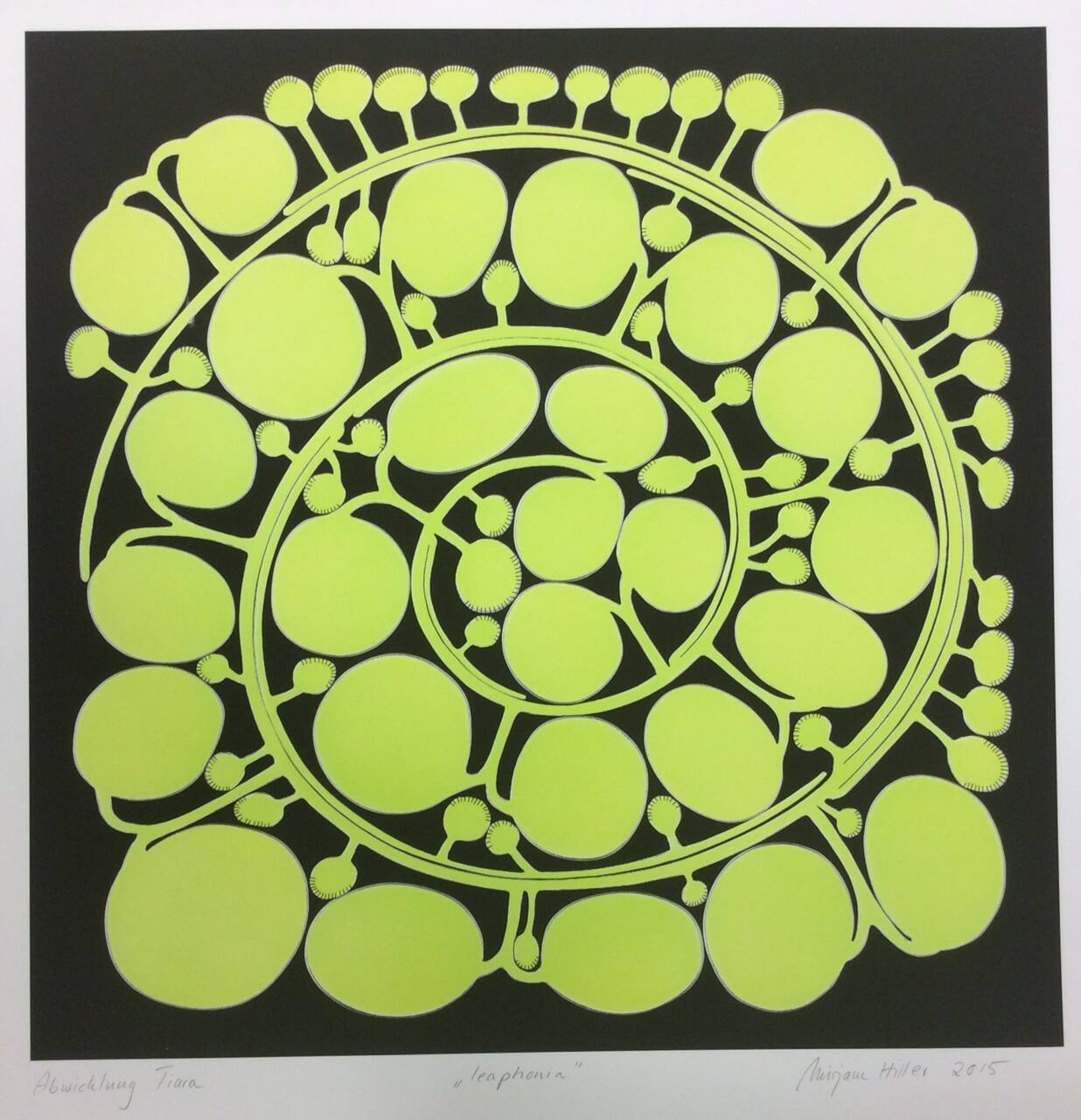 DescriptionThis work on paper displays a square inkjet print of a spiral pattern of neon yellow-green “leaves” on a black background. The print is on white paper. It is an image of a scan of the cut out powder coated metal shape of a tiara prior to folding it into a three-dimensional object.Provenance