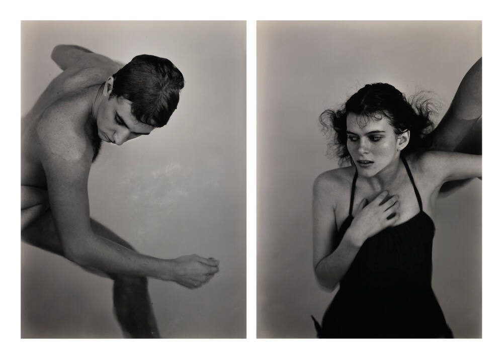 DescriptionLeft of diptych: Image of choreographed man who appears nude bending over with elbow resting on inside of left knee.Right of diptych: Image of woman wearing swimsuit with hand raised to chest as she looks over toward the image of the man.Provenance