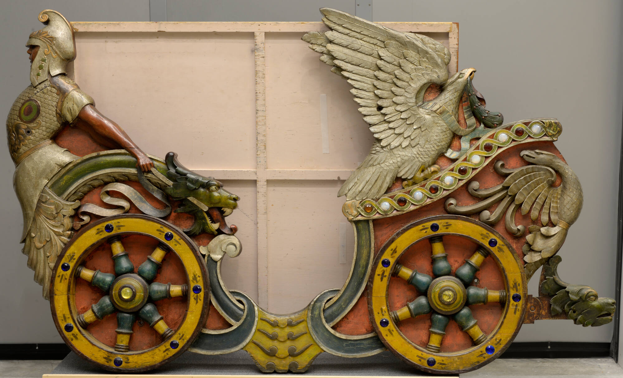 DescriptionThe sculpture is an exterior side panel that would have attached to bench seating on a carousel. It has the appearance of a stylized Roman chariot. The piece is generally U-shaped, the right side of it forming the front of the chariot, and the left side forming the back, with one spoked wheel carved into each side. There are two eagles on the front, one forming the front edge of the chariot car, the other perched atop it, holding a garland in its beak. An armored warrior forms the back of the chariot car. There are also dragon-like heads on the upper edge of the back and extending out in front of the front wheel. The two wheels contain multiple blue faceted glass insets aligned with the wheel spokes. The top edge of the chariot front has a rounded fret design with red and white faceted insets placed in the center of the frets. The reverse of the panel retains fragments of upholstery and brackets which would have supported the seating. The base color of the chariot body is a faded red. The decorative elements are green, gold, blue, and a silvery-grey.ProvenancePossibly Dentzel Company;