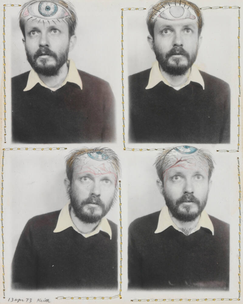 DescriptionGrid of four black-and-white portraits of a bearded man (Keith Smith) wearing a collared shirt under a sweater. Hand-drawn ink illustrations appear on the images; these include a large eye on his head, lashes, and hair follicles.ProvenanceThe Hall Family Foundation, Kansas City, MO, 2016;