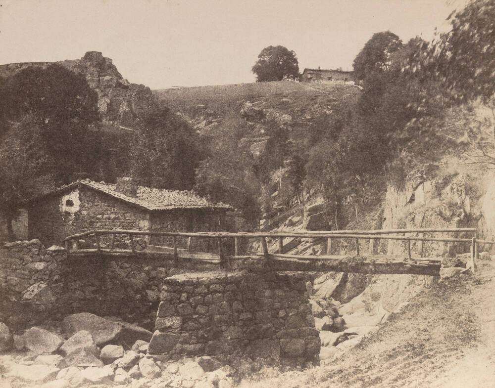 DescriptionImage of rustic bridge leading to small stone house in valley between rocky hills. A cross is placed at the peak of the roof and another home sits on the hill above with trees surrounding. The creek below the bridge is dry and large rocks surround the home.ProvenanceThe Hall Family Foundation, Kansas City, MO, 2016;
