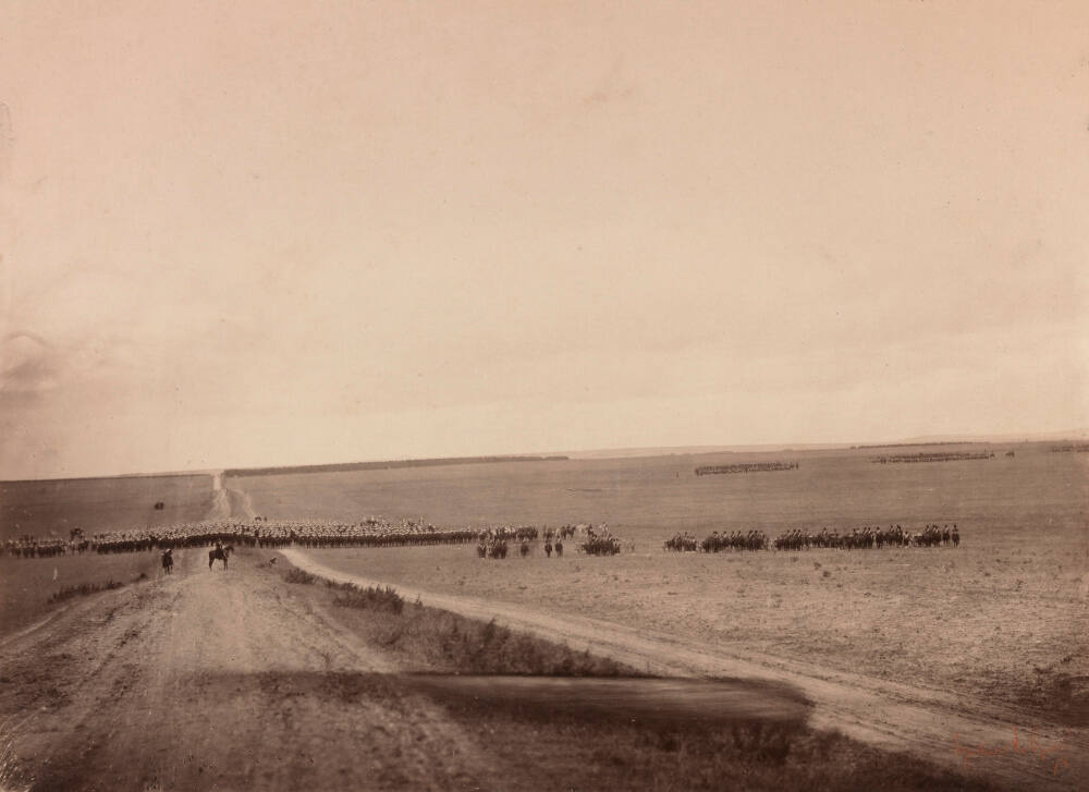 DescriptionImage of dirt road leading to cavalry lined up in rows; some horses are attached to wagons. Two soldiers on horses appear in the center of the road and in the far distant background more groups of soldiers fill in across the flat landscape. A blurry streak crosses of the road in the foreground.ProvenanceThe Hall Family Foundation, Kansas City, MO, 2016;