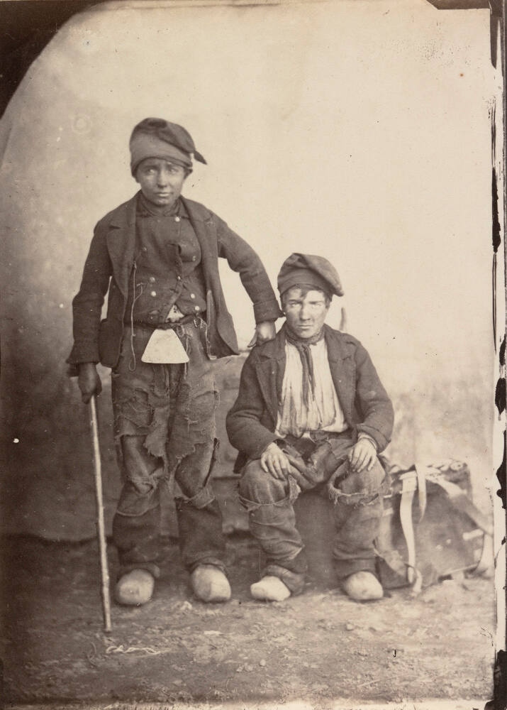 DescriptionImage of two young men; one standing with hand on shoulder of the other one which is seated. They both wear layers of tattered clothing, clogs, and floppy hats. Their expressions are neutral; the floor in front of them is dirt, and the background is blown out/bright white.Gallery LabelCharles Nègre refers to the threadbare young men in this photograph as “Savoyards” (originating from the Savoy region of France). Impoverished, migrant Savoyards have appeared in European art since the 1700s, and Nègre’s title could be shorthand for a certain type of person seen in the streets of Paris, regardless of the two boys’ actual place of origin.