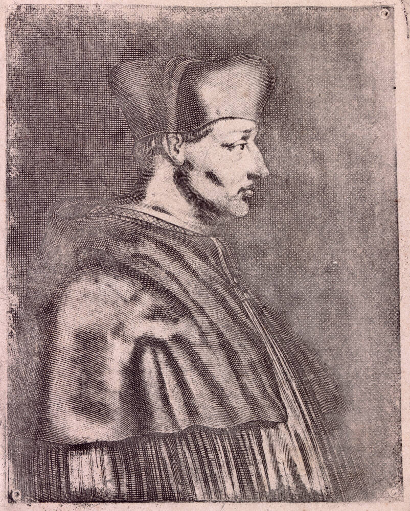 DescriptionImage of man in profile wearing capelet over shoulders with a longer, gathered gown beneath. His ear is partially covered by his Cardinal’s cap, his cheek bones cast a dark shadow, and he has full lips. There is a tiny gridded background behind him.ProvenanceThe Hall Family Foundation, Kansas City, MO, 2016;