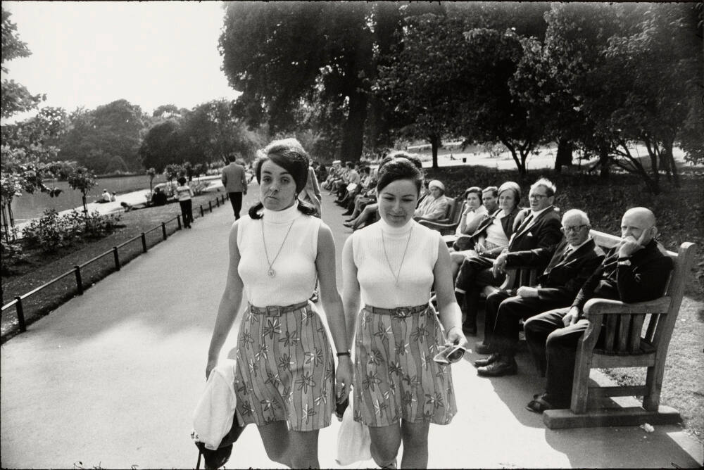 DescriptionImage of two women identically dressed in sleeveless tops with patterned skirts walking down a sidewalk with people seated on the right in a long row of benches that overlook a body of water.Gallery Label"No one moment is most important … Any moment can be something." -Garry Winogrand