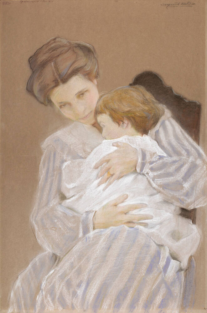 DescriptionA small child wearing a white gown sits on its mother's lap, facing left. The mother is seated on a chair with a domed crest rail that can be seen at the right of the composition over her left shoulder. She holds the child with both hands while fixing her gaze beyond its face. She wears a blue and white striped gown with a lace collar.Exhibition HistoryMore research is necessary.