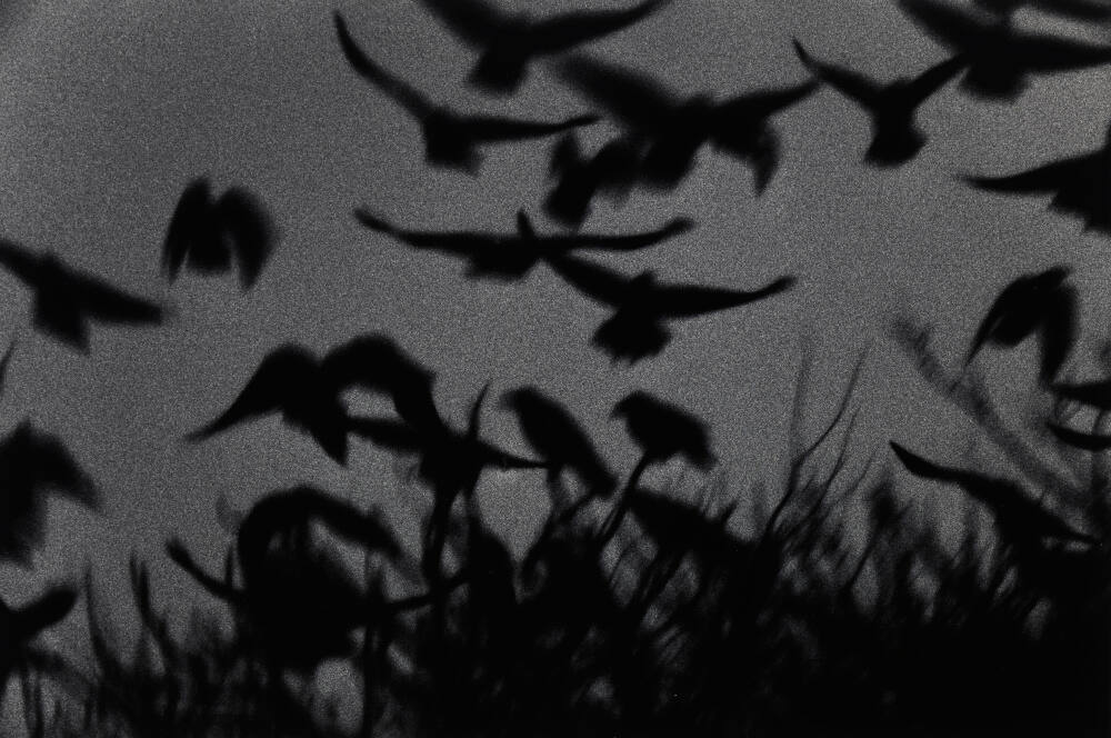 DescriptionGrainy, dark, and impressionistic image of a flock of ravens appearing like black silhouettes in flight against a gray sky above blades of grass in foreground.ProvenanceThe Hall Family Foundation, Kansas City, MO, 2016;