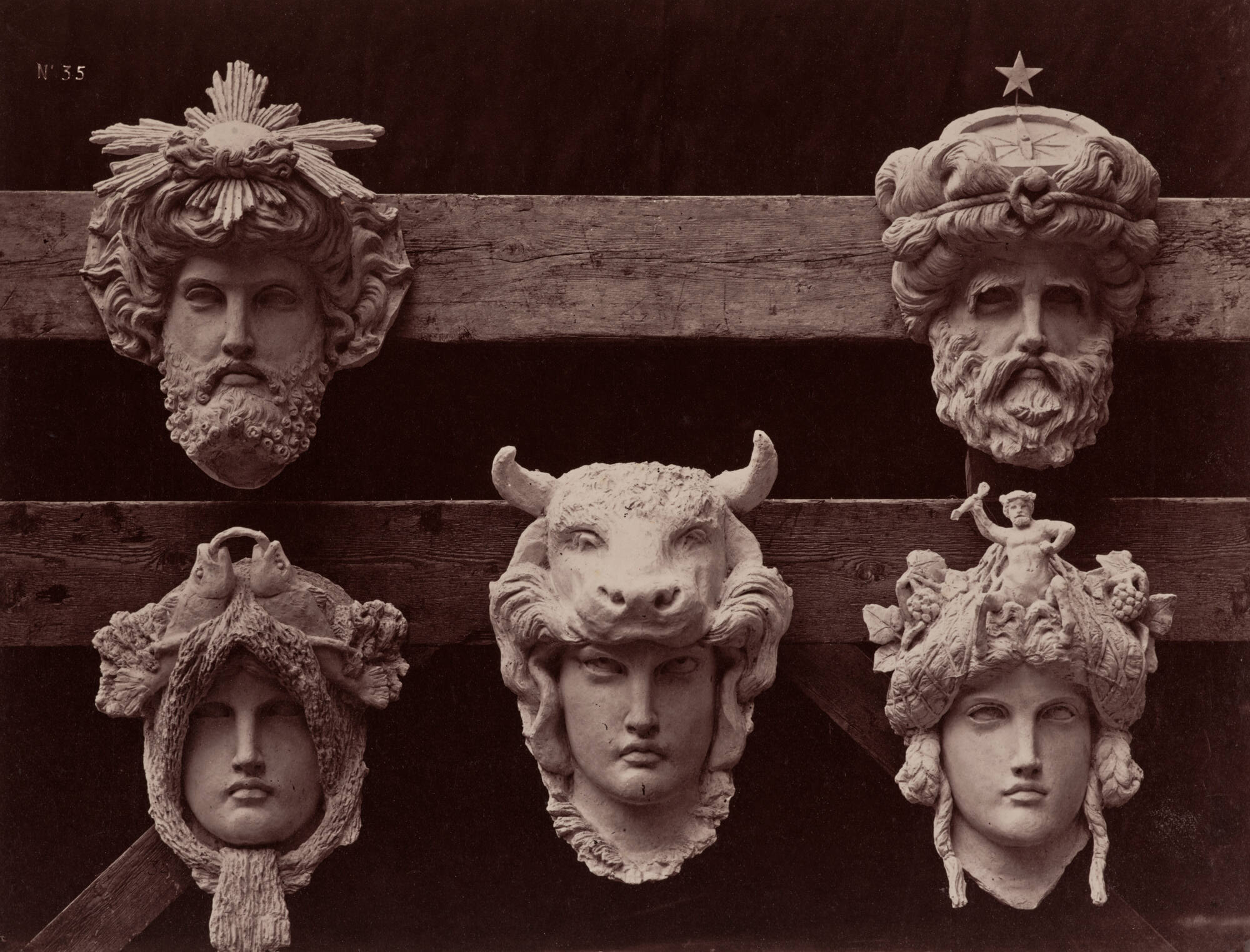 Arranged in rows and mounted onto wooden beams, five stone faces stare out from Louis-Émile Durandelle’s photograph. These sculptures were later installed on the ceiling of the spectacularly adorned Parisian Opéra Garnier. Durandelle documented the opera house’s construction for 10 years in collaboration with its architect, Charles Garnier, and often photographed its ornate sculptures that featured mythological and allegorical characters, like those in this image. Such themes were popular in the arts at this time and could be found in photographs, paintings, prints, and architecture.
