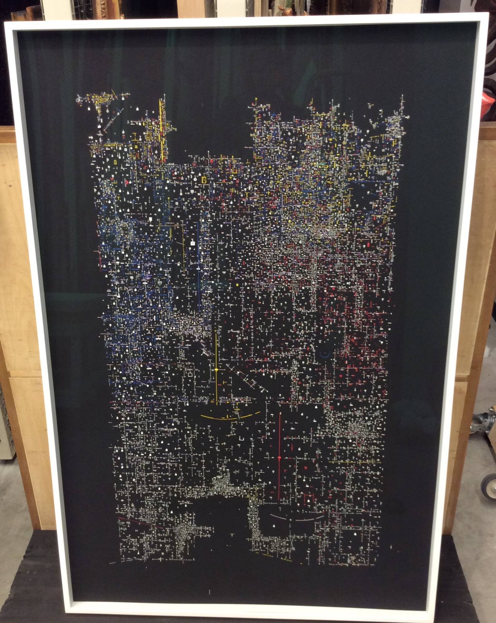 DescriptionThis work of art consists of an intricate configuration of delicate white lines, circles and squares in glyph and grid-like patterns that are superimposed on a black ground.ProvenanceWith Galeria Nara Roesler, by 2016.