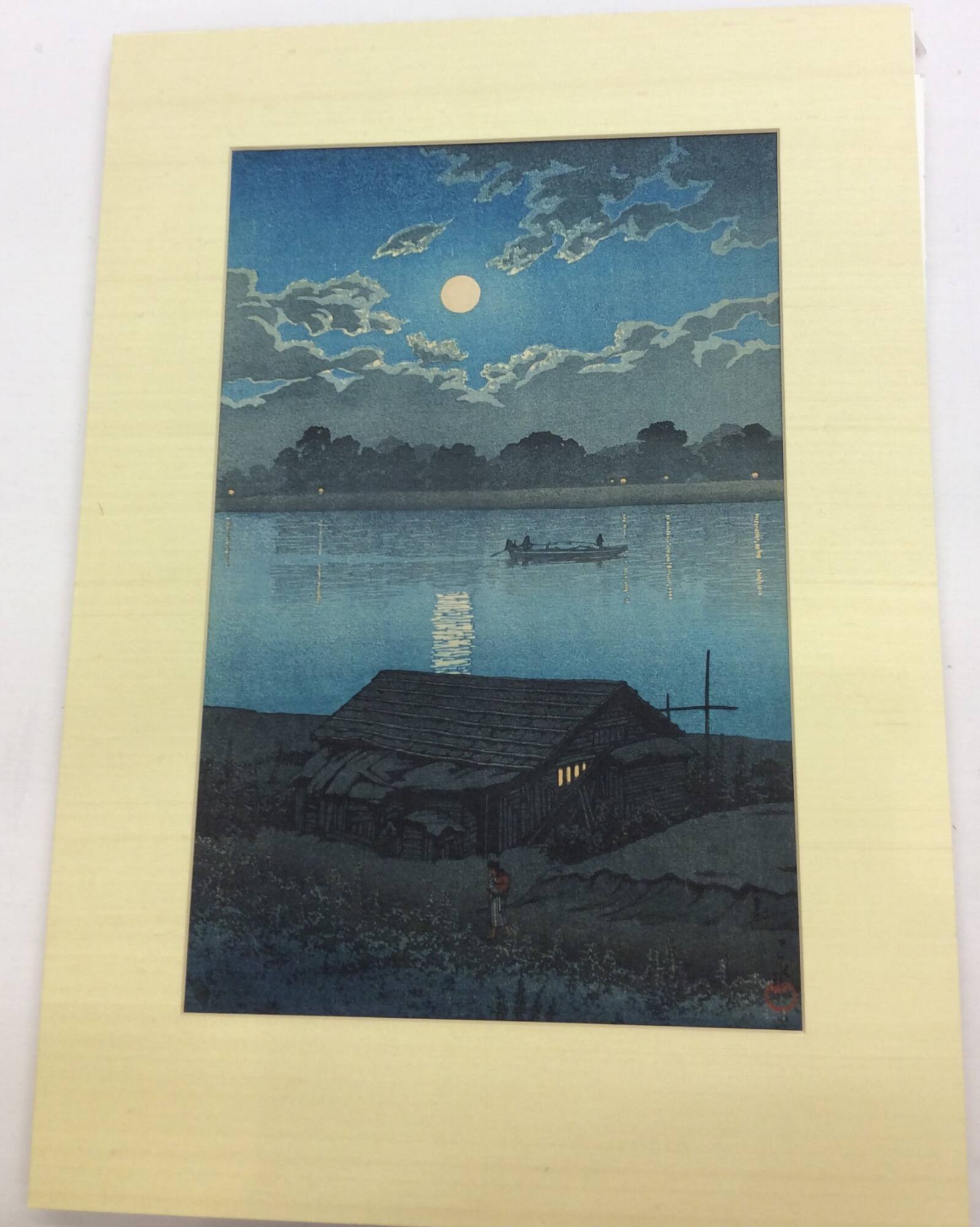 DescriptionThe woodblock print shows a full moon over a river. A small boat travels on the river. In the foreground, a woman carrying a baby on her back walks in front of a farmhouse. Various shades of blue dominates the color scheme, with some light blue that suggests the glowing of moonlight.