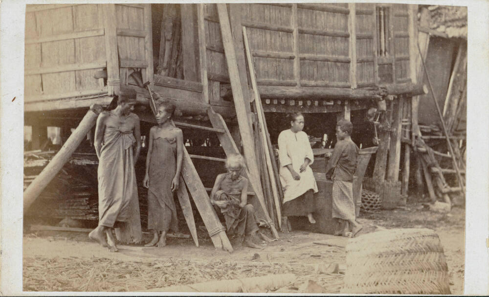 DescriptionImage of Malaysian women with bare feet and sheet-like garments wrapped around their bodies standing near an elevated wooden hut.Provenance
