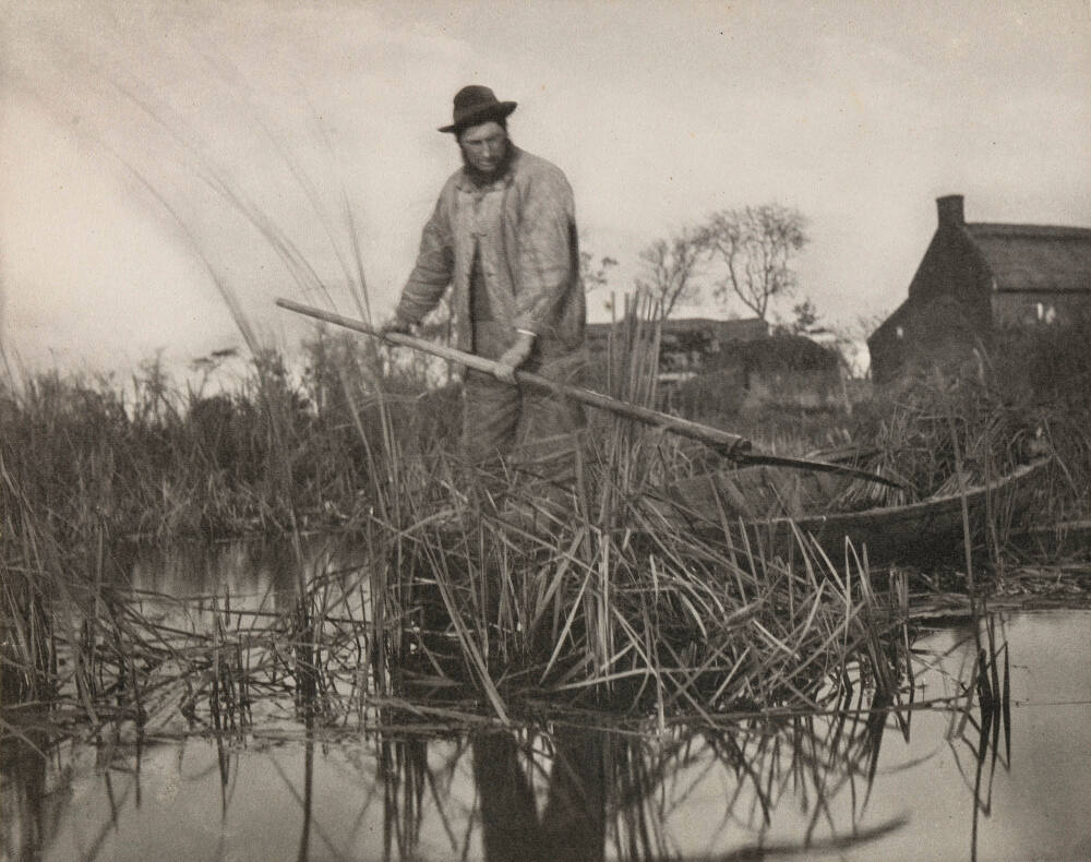 Peter Henry Emerson championed “naturalistic photography,” a theory that camera focus should mimic the workings of human sight by placing the primary subject in sharper focus and leaving outside areas less defined. Here, he emphasizes the sickle hook and a few reed stalks by rendering them in sharper focus than the laborer. Emerson created many influential photography books that were illustrated with prints such as this one, which was originally included in a volume of Life and Landscape on the Norfolk Broads (1887).