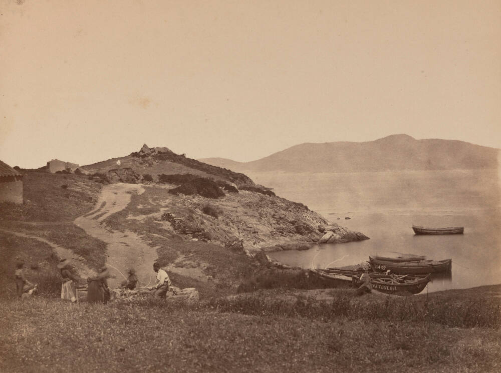 DescriptionScenic image of figures seated near stone ledge at base of dirt road just off coast; another man sits alone in grass looking towards others. There are several boats docked near the rocky shore and mountains in the distance.ProvenanceThe Hall Family Foundation, Kansas City, MO, 2017;