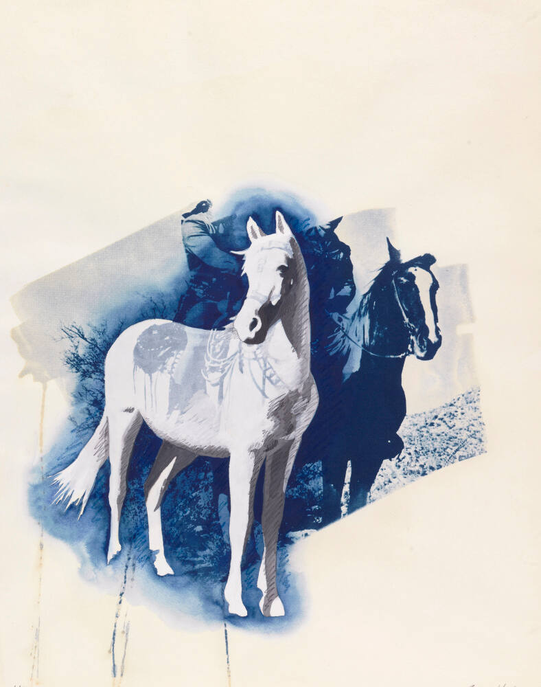 DescriptionImage of white horse with saddle standing in front of a blue horse. Both horses have riders whose heads are cropped from the image. Streaks of blue watercolor stream down lower left.ProvenancePurchased from Joseph Bellows Gallery, La Jolla, CA by The Hall Family Foundation, Kansas City, MO, 2017;