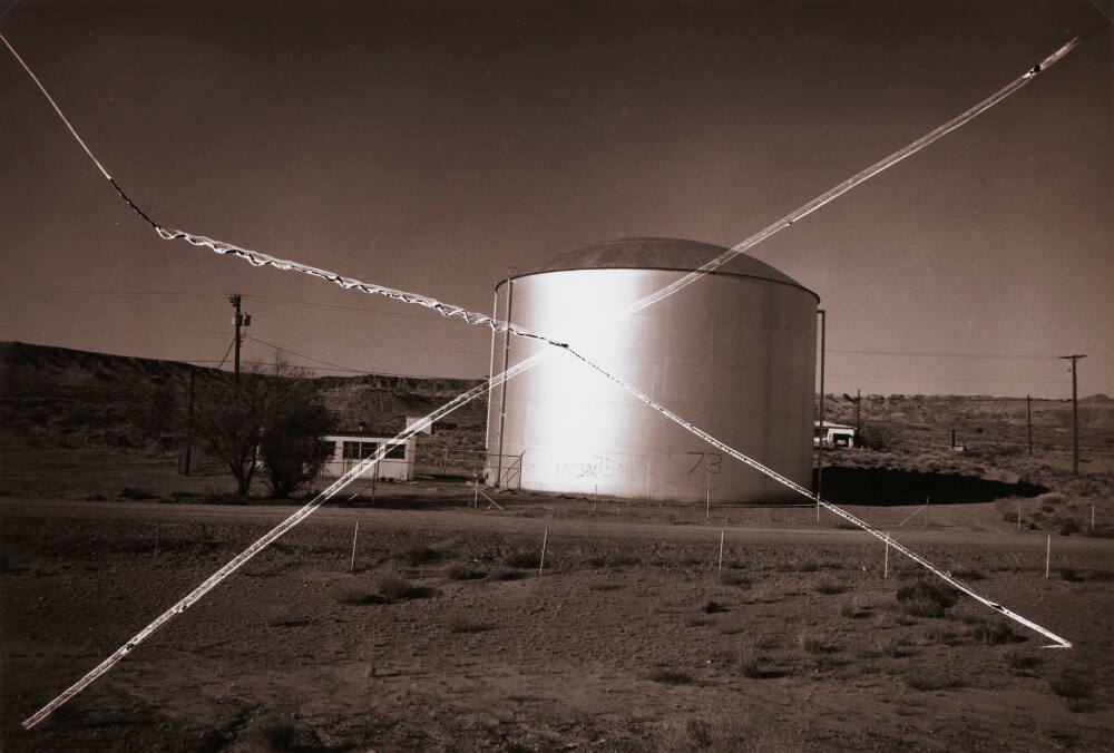 DescriptionSepia toned image of a large metal tank with graffiti on the front surrounded by a chain-link fence in the middle of a sandy landscape with power lines in the background, a prominent jagged X was gouged into the negative, thus partially obscuring the image.Gallery LabelTo produce this print, Thomas Barrow photographed a spare landscape and then scratched his negative with a large X. Printing from the altered negative, he calls attention to the marring of the subject matter. This process— which simultaneously reveals and obscures the image—emphasizes the photograph’s status as an object, rather than a transparent "window-on-the-world."