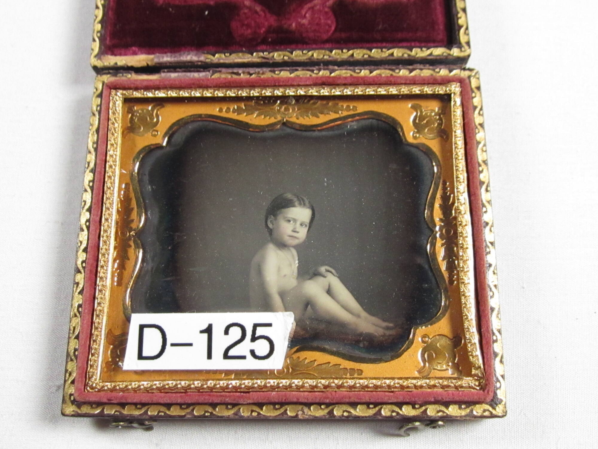 DescriptionImage of nude child with rosy cheeks and necklace with gold embelishment; seated in profile. This sixth plate daguerreotype with decorative brass mat is housed in leather case (detached lid) with embossed burgundy velvet liner. The brown case is decorated with gold trim and a floral design in the center.ProvenanceWith the Hall Family Foundation, Kansas City, MO by 2017;