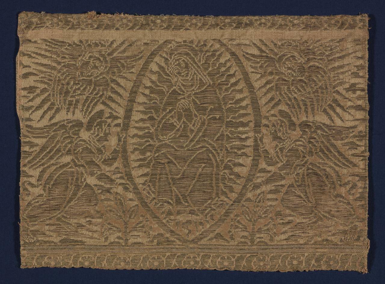 DescriptionYellow ground, Madonna in mandorla and angels in gold thread.Exhibition HistoryThreads of Gold: Brocades and Embroideries for the Church, Spencer Museum of Art, University of Kansas, Lawrence, KS, July 2-September 1, 1985, no. 13.