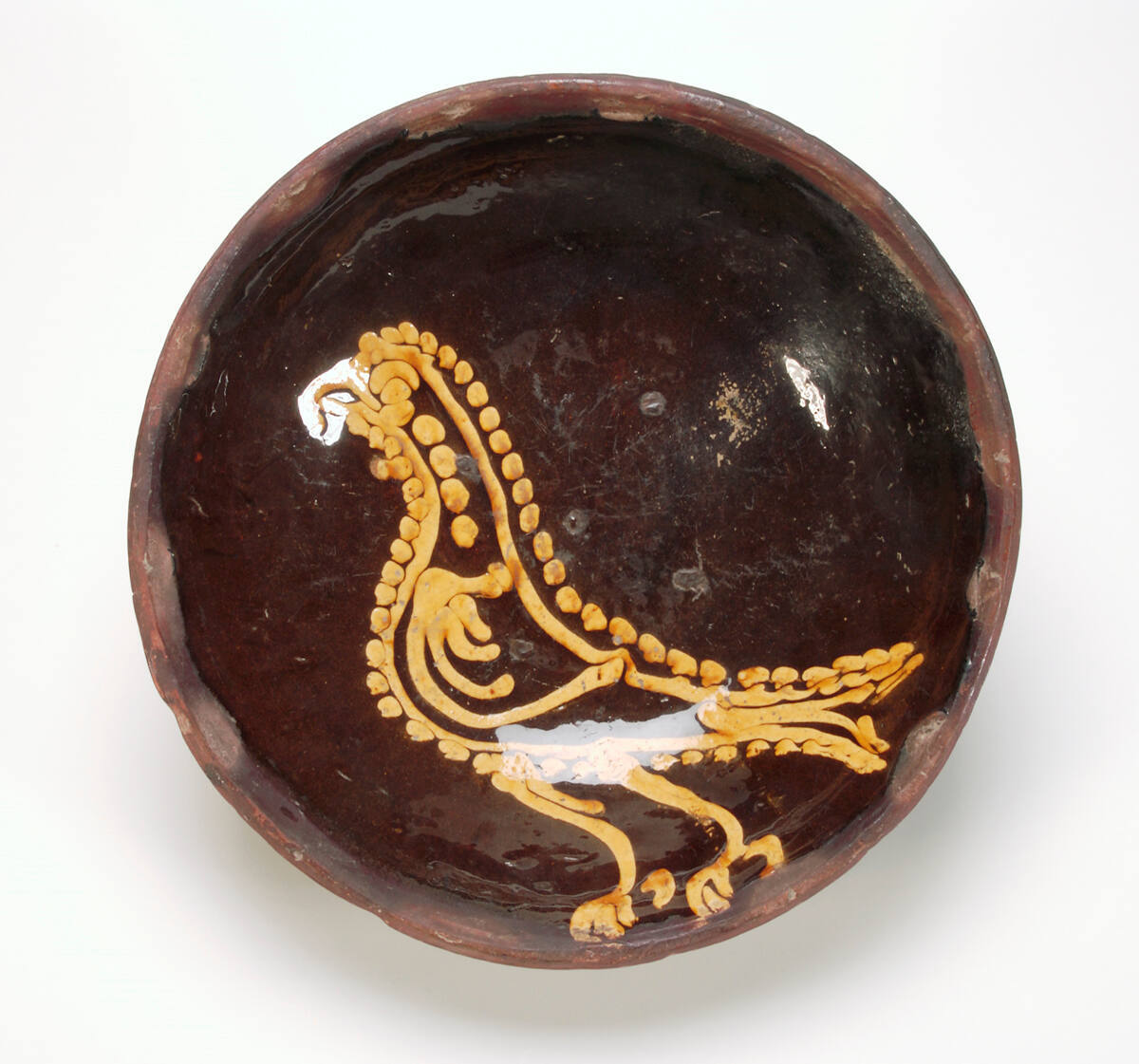 DescriptionDark brown ground decorated with a hawk outlined by dots in cream slip.