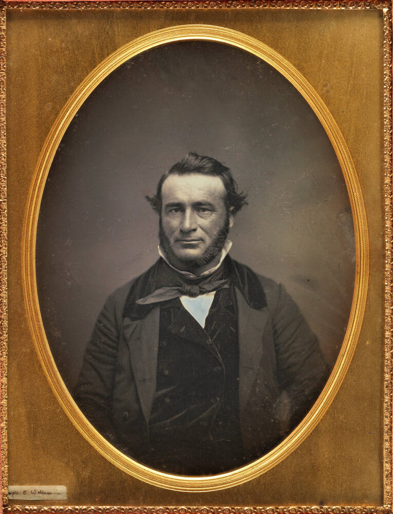 DescriptionPortrait of a seated man with a neck beard wearing a suit jacket, vest, and tie. This whole plate daguerreotype is housed in a brass oval mat inside of a brown leather covered case with a pink silk liner.ProvenanceThe Hall Family Foundation, Kansas City, MO, 2017;