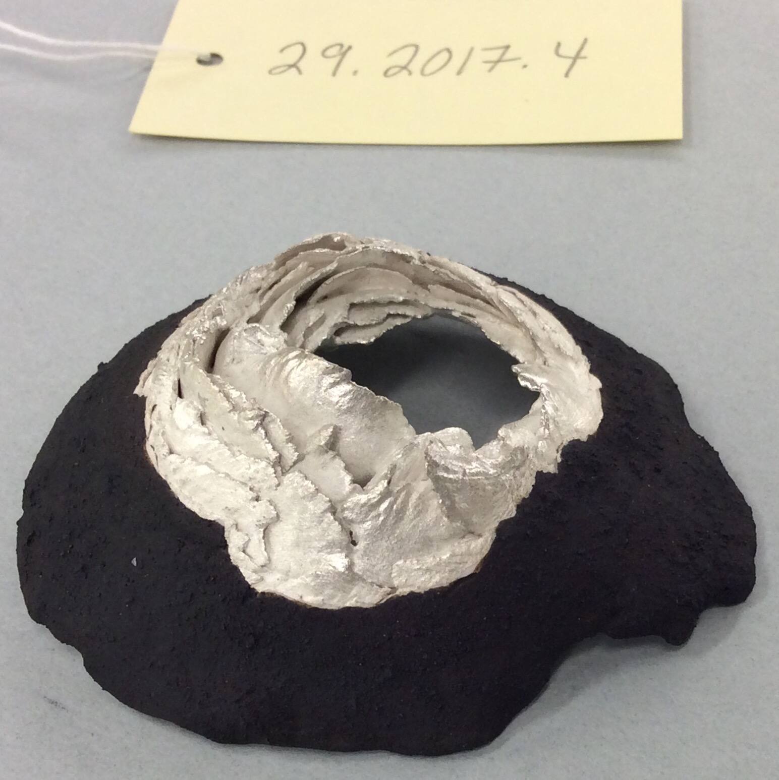 DescriptionA black organic-shaped brooch with multi-layered series of silver porcelain “petals” surrounding an open center. Layered or painted with black stoneware from the outer edge to the start of the curling, the exterior of the porcelain form has a rough and textured surface. The interior layers are painted with silver and have a matte luster. A single silver pin is attached to the back of the ceramic work with an adhesive, so that it can be attached to fabric or clothing. The back of the piece has clear outlines of the silver paint layer around the interior of the central void, and the exterior of the piece is framed in a black stoneware application. The artist’s initials, KS, are painted on the verso in black.ProvenancePurchased from the artist by Robert A. Hiller, by 2017;