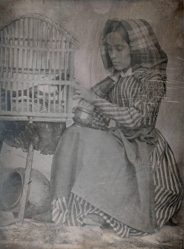 DescriptionImage of woman wearing striped dress and plaid bonnet seated in front of birdcage. She holds a small bowl in her lap and reaches in to feed the bird with her left hand. This quarter plate uncased daguerreotype is sealed with paper backing and housed in British style paper mat.ProvenanceGérard Lévy, Paris, France;