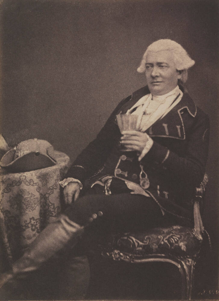 DescriptionPortrait of seated man wearing powdered wig holding a glass in his left hand; he's dressed in a jacket with a wide collar and tall boots.Gallery LabelProvenance