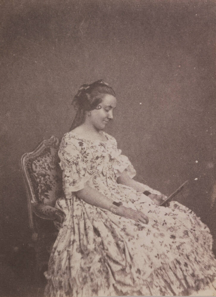 DescriptionPortrait of young woman seated in profile. She looks down and smiles at something she is holding in her left hand. She's wearing a full-length floral dress and bracelets.ProvenanceWith the Hall Family Foundation, Kansas City, MO by 2017;