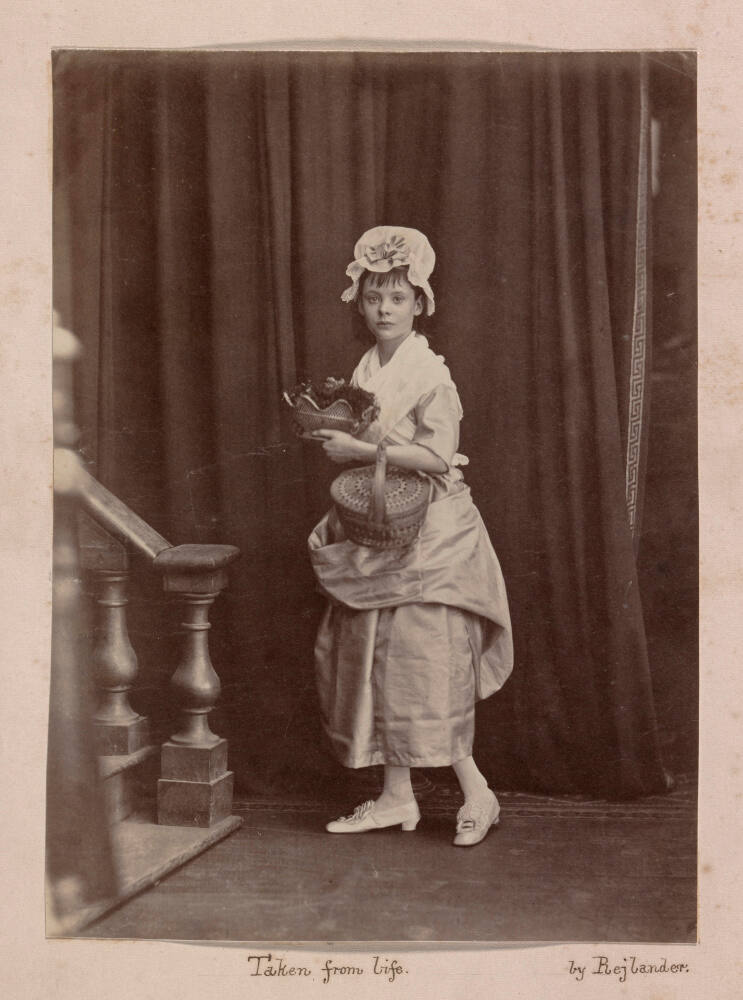DescriptionImage of young woman in satin dress and bonnet with basket over wrist as she carries a bowl. There are floor length curtains behind her and a staircase in front.Gallery LabelArtistic circles fiercely debated photography’s status as fine art throughout the 1800s. Oscar Rejlander, who studied painting and sculpture in Rome before settling in England, firmly believed that photography must emulate painting. Taking inspiration from staged scenes of everyday life in English genre painting, Rejlander composed his photographs with costumed characters like this housemaid. Based on the title—Come Along—the young woman appears to be called to attention by an unseen person just beyond the picture’s frame.