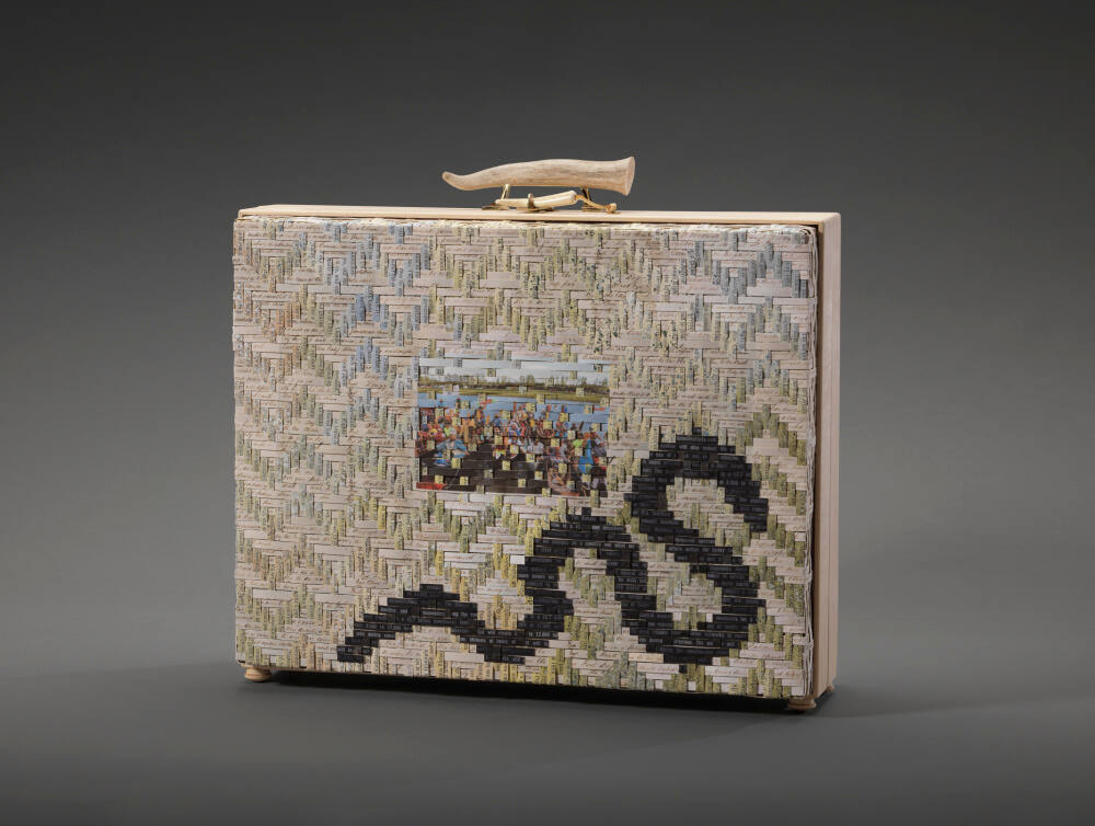 DescriptionWooden (legal) briefcase covered in strips of paper woven together in a zigzag pattern, the Cherokee "water" pattern. The interior and extrior photographs are of the Oceti Sakowin camp, an eagle feather fan, and a Lakota prayer.ProvenancePurchased from the artist by Dr. Loren G. Lipson, M.D., 2017.