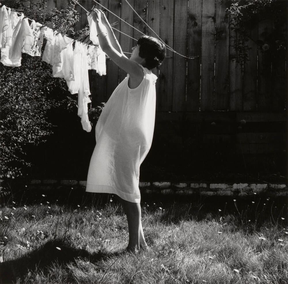 DescriptionImage of pregnant woman wearing sleeveless nightshirt hanging children’s laundry on clothesline. The grass she stands in is filled with tiny wildflowers.Provenance