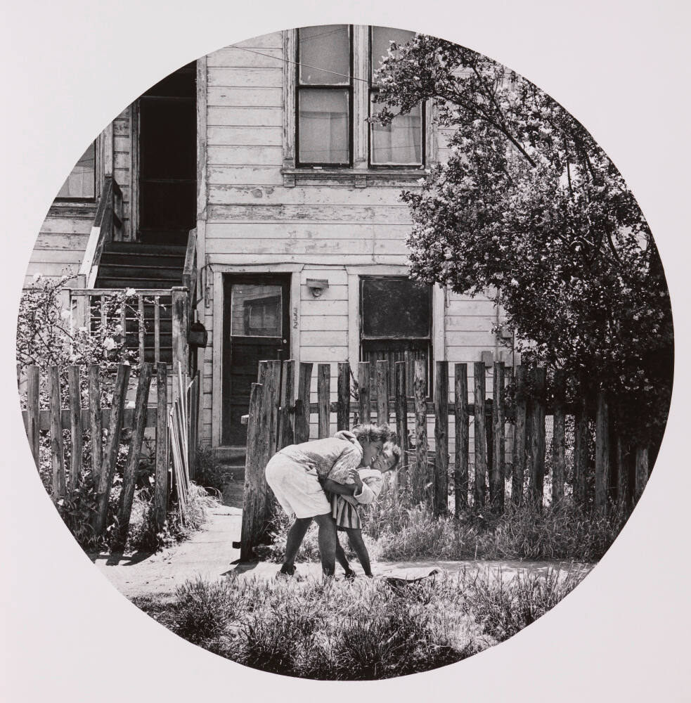DescriptionCircular image of two kids smiling on sidewalk beside wooden fence in front of house. The taller child bends down to hug the littlier one.ProvenanceJoanne Leonard, Ann Arbor, Michigan;