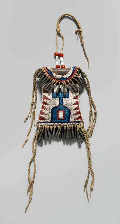 Gallery LabelBecause Plains Indian clothing had no pockets, specialized cases made to hang from the belt were created for tools and personal effects. Strike-a-light bags were so named because they were made originally to hold flint, steel and tinder for fire-making, but they were also used during the early reservation era to store ration cards. The intricately beaded design incorporates a house-like image often seen on Kiowa beadwork, but its specific meaning remains unknown outside native oral tradition. The fringe of metal cones produced a soft, tinkling sound with the slightest movement.
