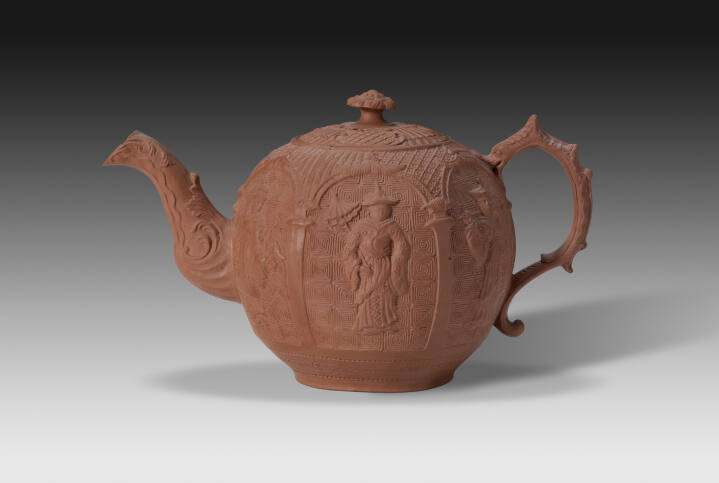 DescriptionTeapot molded in relief: six arcaded panels with a fret ground in each of which stands a full-length Chinese male figure bearing a parasol in one hand and a bird in the other; rococo scroll spout and loop handle. Tray has a molded shell edge.Exhibition History