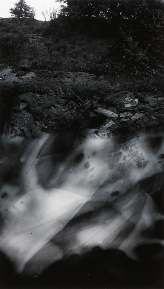 DescriptionDark image of stratification of rock layers with an evergreen tree at the upper left and lighter, blurred abstract images overlapping at the bottom.ProvenanceEstate of Michael Bishop;