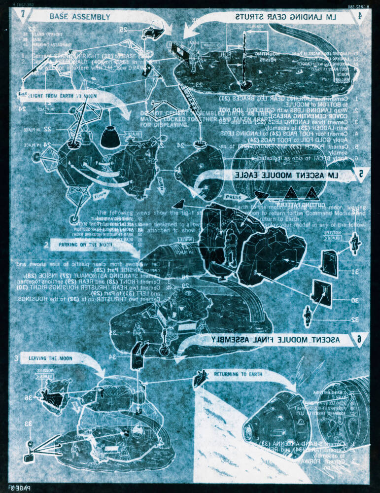 DescriptionBlue-hued image of a page from a book with diagrams of an astronaut, which include his landing gear and ascent modules. Some of the images and text are reversed and overlapping.ProvenanceEstate of Michael Bishop;