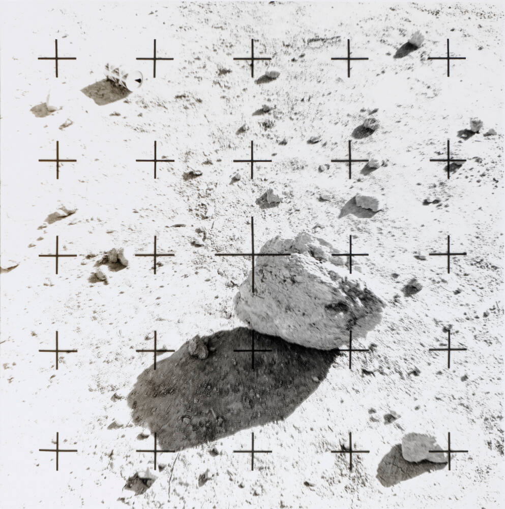 DescriptionImage of rocks scattered over a rough surface with the largest rock near the center. A grid of plus signs is printed over the image.Gallery LabelDescriptions of the moon’s surface remained shrouded in speculation until astronauts photographed the lunar terrain in the late 1960s and early 1970s. Michael Bishop emulated the look of NASA’s pictures in a body of work titled Space/Technology. At first glance, the sparse landscape and horizonless vantage point seen through a gridded surface appear remarkably similar to NASA’s official photographs (see Moonscape, 1971, which hangs nearby). A closer reading of the images reveals discarded cans or Bishop’s shadow: a humorous reminder that these views are earthbound fabrications.