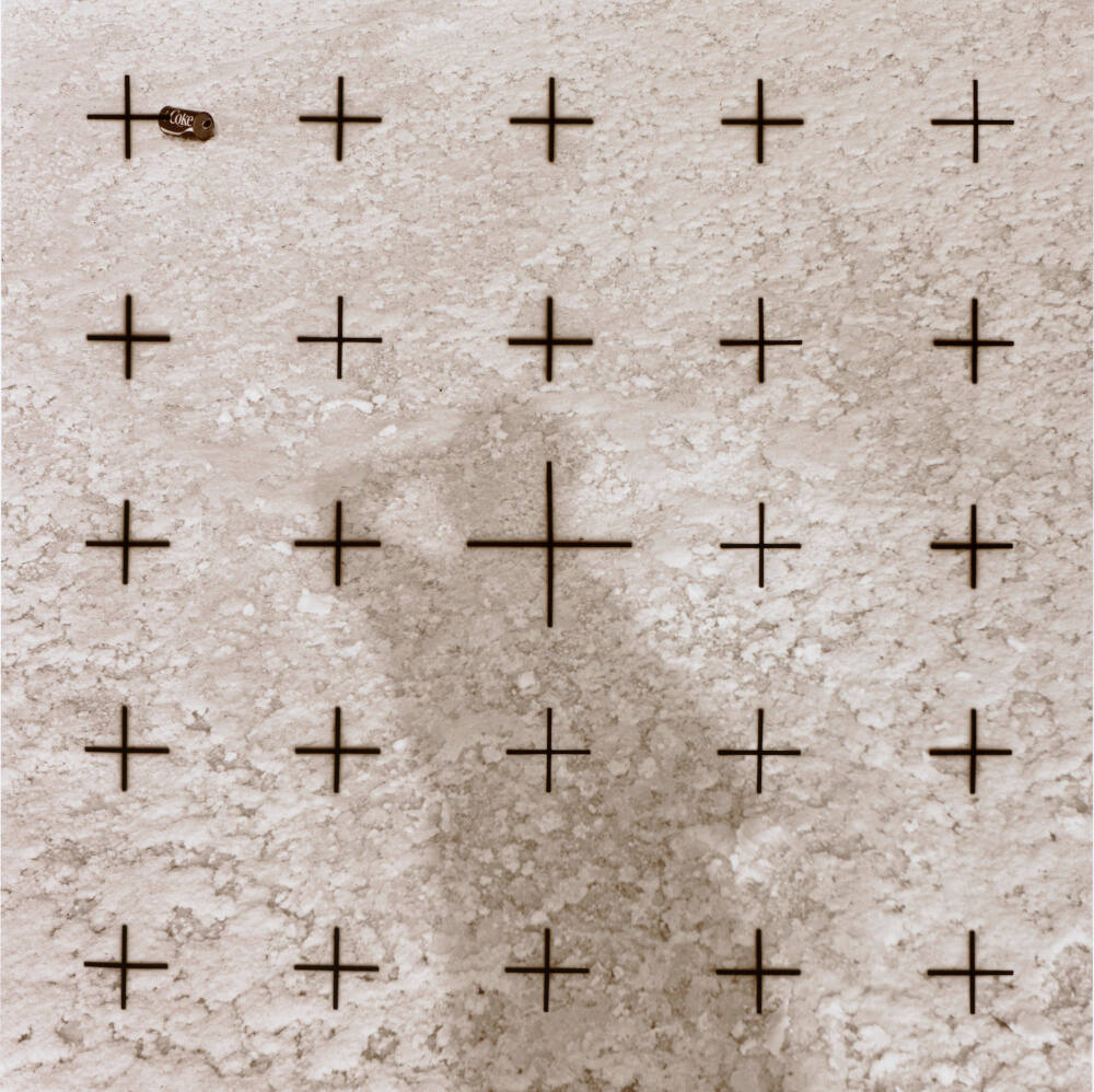 DescriptionImage of cracking surface with shadow of a figure near center and a Coke can in the upper left corner. A grid of plus signs is printed on top of the image.Gallery LabelDescriptions of the moon’s surface remained shrouded in speculation until astronauts photographed the lunar terrain in the late 1960s and early 1970s. Michael Bishop emulated the look of NASA’s pictures in a body of work titled Space/Technology. At first glance, the sparse landscape and horizonless vantage point seen through a gridded surface appear remarkably similar to NASA’s official photographs. A closer reading of the images reveals discarded cans or Bishop’s shadow: a humorous reminder that these views are earthbound fabrications.