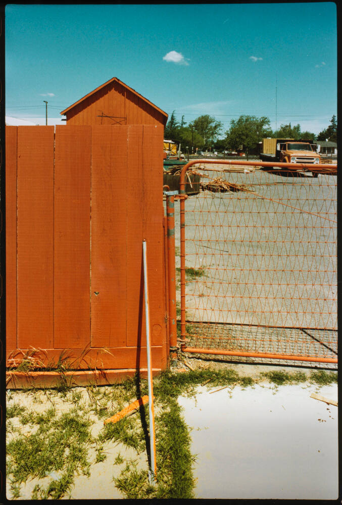 DescriptionImage of metal gate attached to wooden fence - both painted orange. Behind the fence is a work truck, piles of boards, and railroad tracks. The image is printed with a narrow black border.ProvenanceEstate of Michael Bishop;