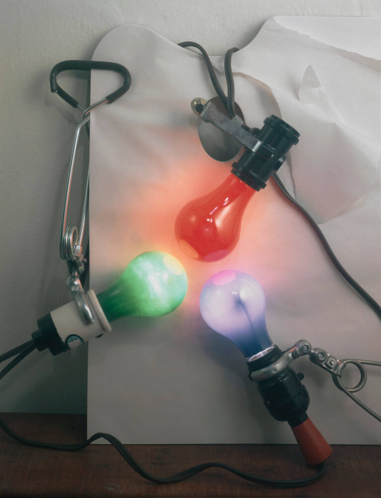 DescriptionImage of three colored light bulbs (green red, and purple) each screwed into a socket and held in place with a metal clamp. They are arranged in a triangular pattern.ProvenanceEstate of Michael Bishop;