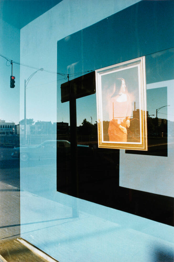 DescriptionImage of framed portrait of a woman wearing orange dress; it is seen hanging in a window with reflections from the street outside.ProvenanceEstate of Michael Bishop;