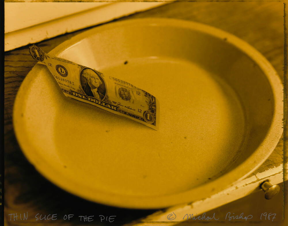 DescriptionImage of a one dollar bill trimmed and resting in a pie dish. Overall yellow hue.ProvenanceEstate of Michael Bishop;