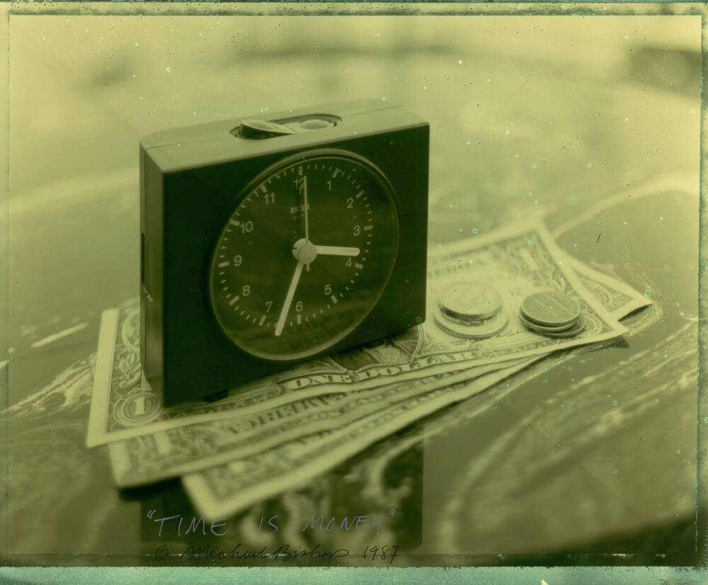 DescriptionImage of a square table clock resting on top of three one dollar bills with coins nearby. Overall green hue.ProvenanceEstate of Michael Bishop;