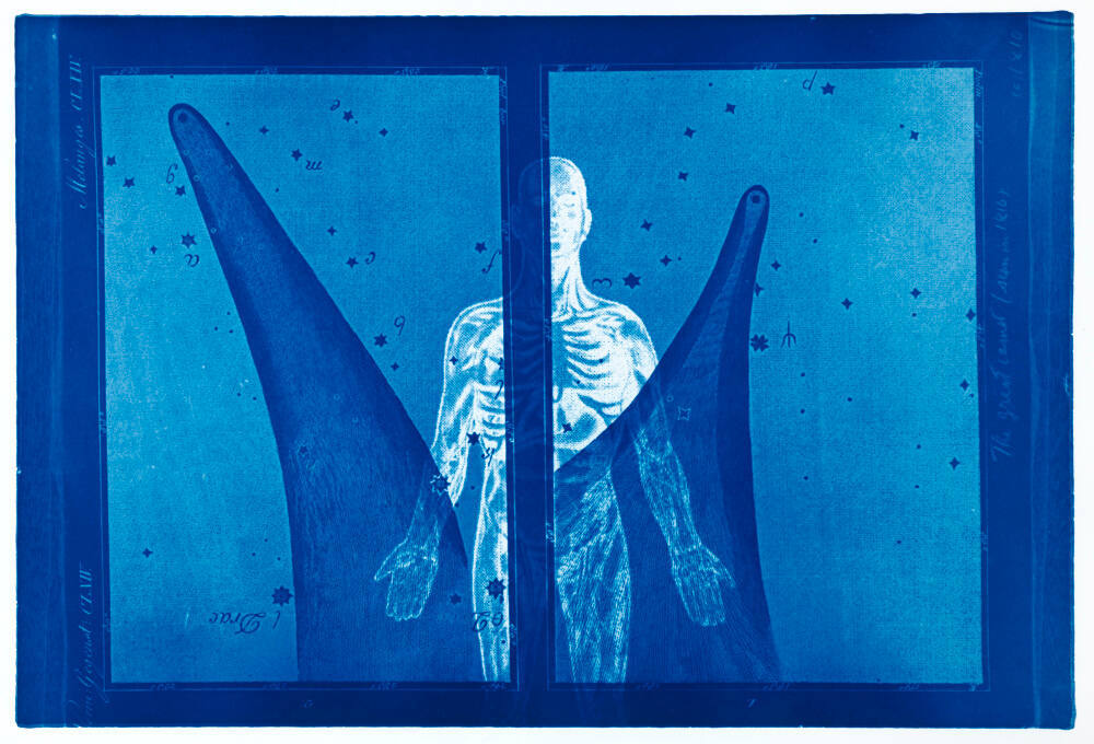 DescriptionBlue-toned image of a pixelated figure with arms outstretched and interior musculature visible. Scattered around the figure are tiny dark blue stars - many of which are labeled with letters or numbers. In the right margin, it reads "The great comet (seen in 1810)".ProvenanceEstate of Michael Bishop;