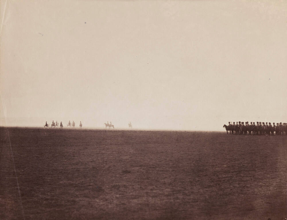 DescriptionImage of cavalry gathered along horizon line near right with a few scattered along the left - partially hidden amidst the fog. A flat grassy landscape fills the foreground.Gallery LabelIn this photograph, Gustave Le Gray transforms a routine military maneuver into a haunting landscape. The spare, off-center composition of the soldiers and the image’s hazy atmosphere contribute to the scene’s otherworldly effect.