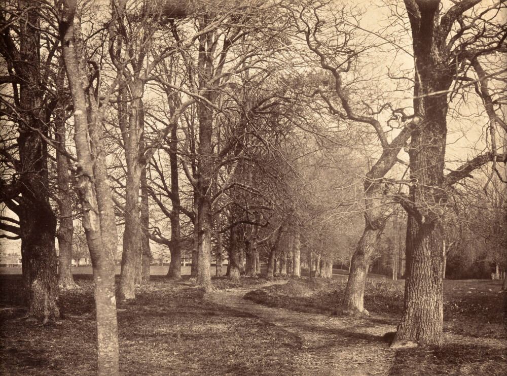 MarkingsOn mat verso, top, white label with black type: “Acc. No. 32 / Benjamin Brecknell Turner / Trees (Pepperharrow Park ?), c. 1853 / Albumen print from paper negative”;
