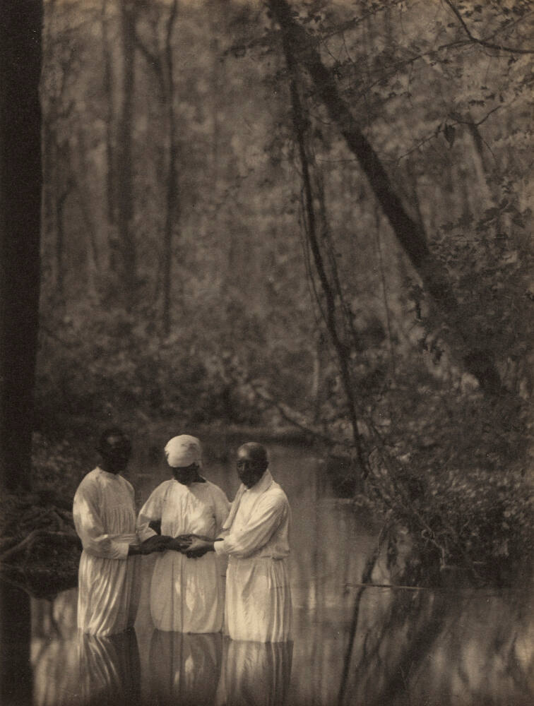 DescriptionImage of three individuals wearing white garments standing in water up to their knees. Two men stand on either side of a woman; their hands holding hers, which are clasped at her waist as she bows her head. A forest surrounds the narrow body of water.Gallery LabelDoris Ulmann’s best-known work was produced after she visited the South Carolina plantation of novelist Julia Peterkin. The plantation employed a large community of Gullah workers—descendants of West African slaves with a distinctive language and culture. This photograph was published in Ulmann and Peterkin’s book Roll Jordan Roll. Baptism combines the soft-focused aesthetic of the Pictorialist style with the photographer’s keen eye for social observation.