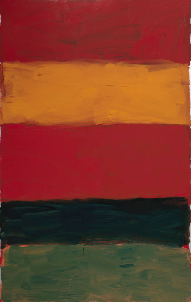 DescriptionThis vertically oriented painting is composed of five horizontal bands of color stacked from top to bottom: rusty red, orange, red, black, and green. The artist has applied the paint using broad brushstrokes in a gestural manner. The delineations between the bands of color are loose and painterly rather than hardedge.Exhibition HistoryNone