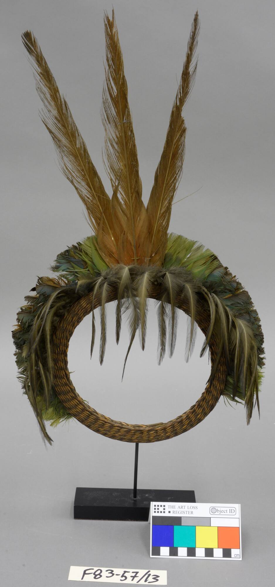 DescriptionBasketry circlet with red, green feathers which circle upper half of basketry. Three longer red feathers placed in upper center.