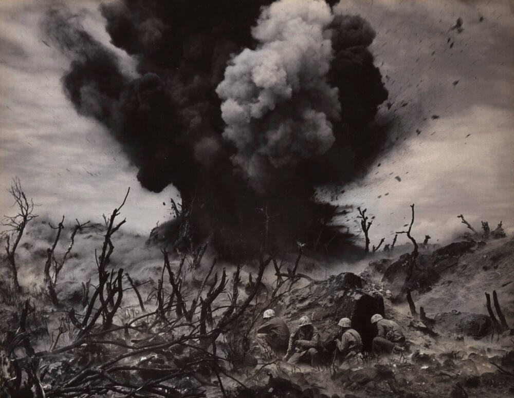 DescriptionImage of four soldiers crouched behind a large rock with plumes of smoke rising to the sky and shrapnel flying through the air. Blackened tree branches fill the landscape surrounding them.ProvenanceThe Hall Family Foundation, Kansas City, MO, 2017;